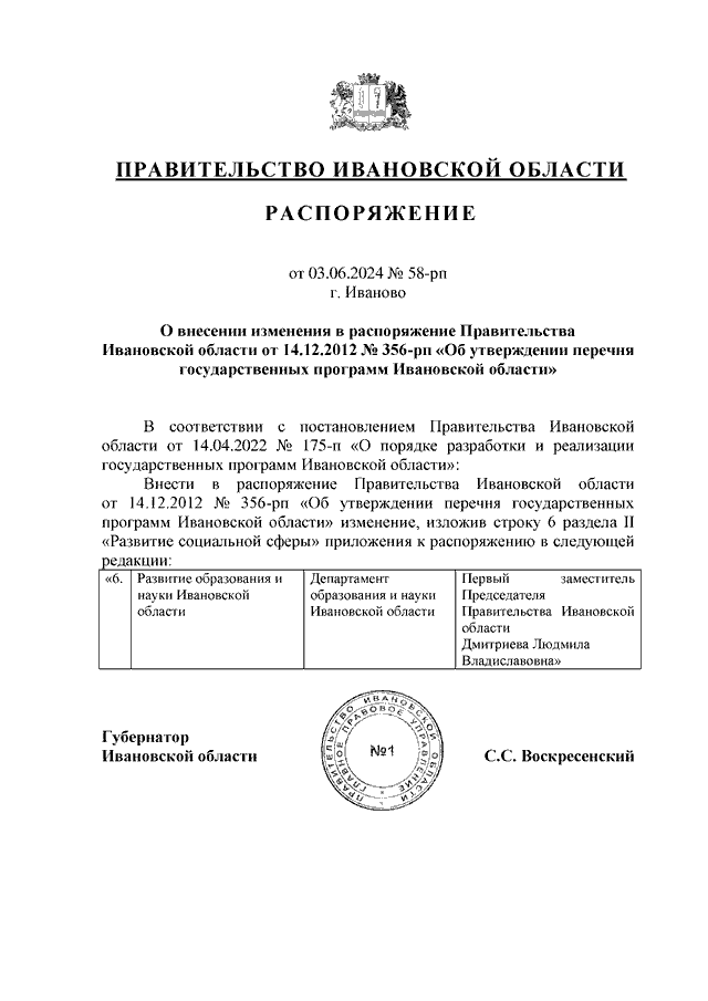 Распоряжение Правительства Ивановской области от 03.06.2024 N 58-рп "О внесении изменения в распоряжение Правительства Ивановской области от 14.12.2012 N 356-рп "Об утверждении перечня государственных программ Ивановской области"