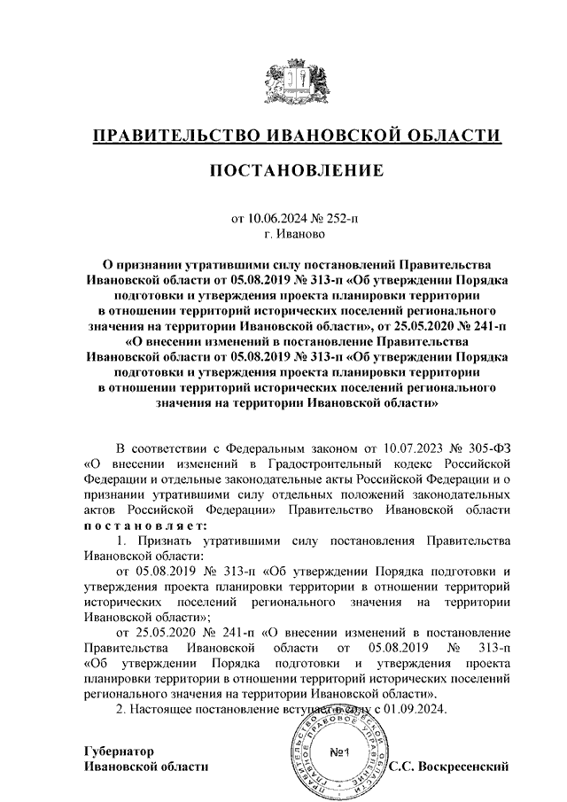 Постановление Правительства Ивановской области от 10.06.2024 N 252-п "О признании утратившими силу постановлений Правительства Ивановской области от 05.08.2019 N 313-п "Об утверждении Порядка подготовки и утверждения проекта планировки территории в отношении территорий исторических поселений регионального значения на территории Ивановской области", от 25.05.2020 N 241-п "О внесении изменений в постановление Правительства Ивановской области от 05.08.2019 N 313-п "Об утверждении Порядка подготовки и утверждения проекта планировки территории в отношении территорий исторических поселений регионального значения на территории Ивановской области"