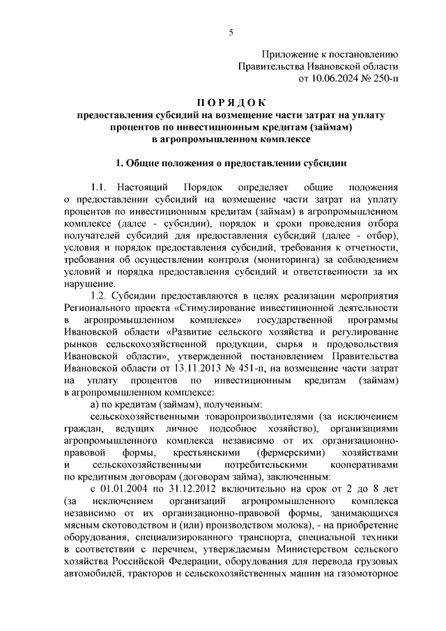 Постановление Правительства Ивановской области от 10.06.2024 N 250-п "Об утверждении Порядка предоставления субсидий на возмещение части затрат на уплату процентов по инвестиционным кредитам (займам) в агропромышленном комплексе"