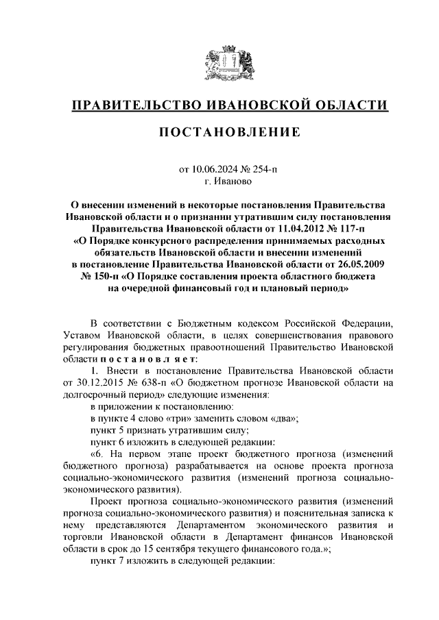 Постановление Правительства Ивановской области от 10.06.2024 N 254-п "О внесении изменений в некоторые постановления Правительства Ивановской области и о признании утратившим силу постановления Правительства Ивановской области от 11.04.2012 N 117-п "О Порядке конкурсного распределения принимаемых расходных обязательств Ивановской области и внесении изменений в постановление Правительства Ивановской области от 26.05.2009 N 150-п "О Порядке составления проекта областного бюджета на очередной финансовый год и плановый период"
