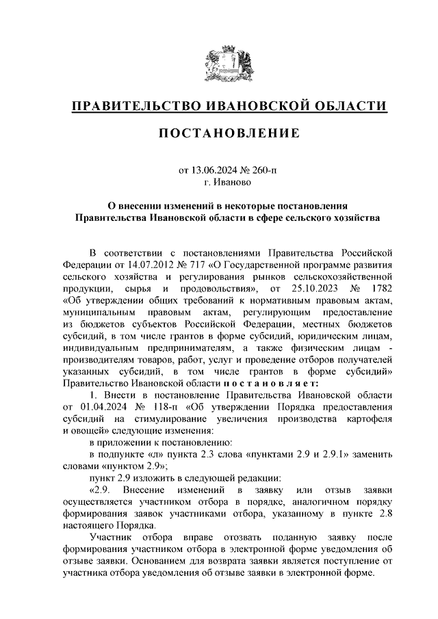 Постановление Правительства Ивановской области от 13.06.2024 N 260-п "О внесении изменений в некоторые постановления Правительства Ивановской области в сфере сельского хозяйства"