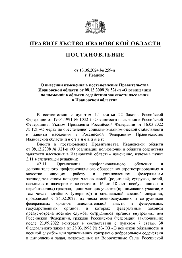 Постановление Правительства Ивановской области от 13.06.2024 N 259-п "О внесении изменения в постановление Правительства Ивановской области от 08.12.2008 N 321-п "О реализации полномочий в области содействия занятости населения в Ивановской области"
