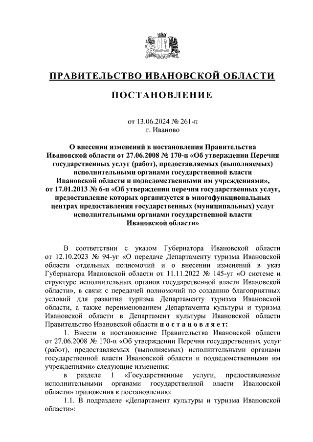 Постановление Правительства Ивановской области от 13.06.2024 N 261-п "О внесении изменений в постановления Правительства Ивановской области от 27.06.2008 N 170-п "Об утверждении Перечня государственных услуг (работ), предоставляемых (выполняемых) исполнительными органами государственной власти Ивановской области и подведомственными им учреждениями", от 17.01.2013 N 6-п "Об утверждении перечня государственных услуг, предоставление которых организуется в многофункциональных центрах предоставления государственных (муниципальных) услуг исполнительными органами государственной власти Ивановской области"