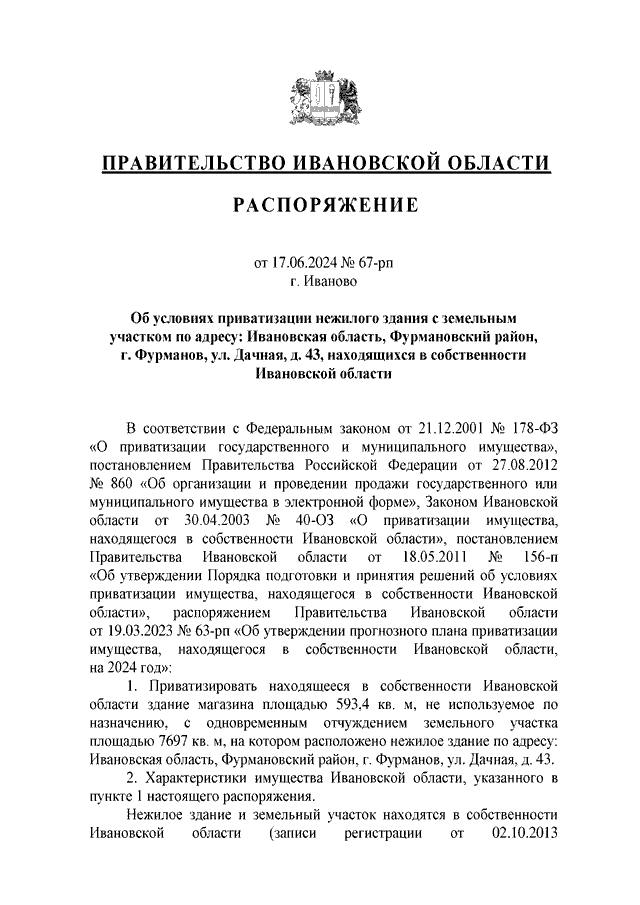 Распоряжение Правительства Ивановской области от 17.06.2024 N 67-рп "Об условиях приватизации нежилого здания с земельным участком по адресу: Ивановская область, Фурмановский район, г. Фурманов, ул. Дачная, д. 43, находящихся в собственности Ивановской области"