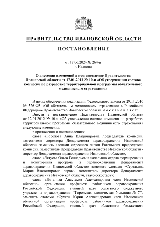 Постановление Правительства Ивановской области от 17.06.2024 N 264-п "О внесении изменений в постановление Правительства Ивановской области от 17.01.2012 N 10-п "Об утверждении состава комиссии по разработке территориальной программы обязательного медицинского страхования"