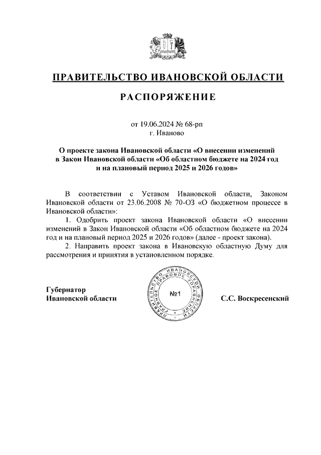 Распоряжение Правительства Ивановской области от 19.06.2024 N 68-рп "О проекте закона Ивановской области "О внесении изменений в Закон Ивановской области "Об областном бюджете на 2024 год и на плановый период 2025 и 2026 годов"