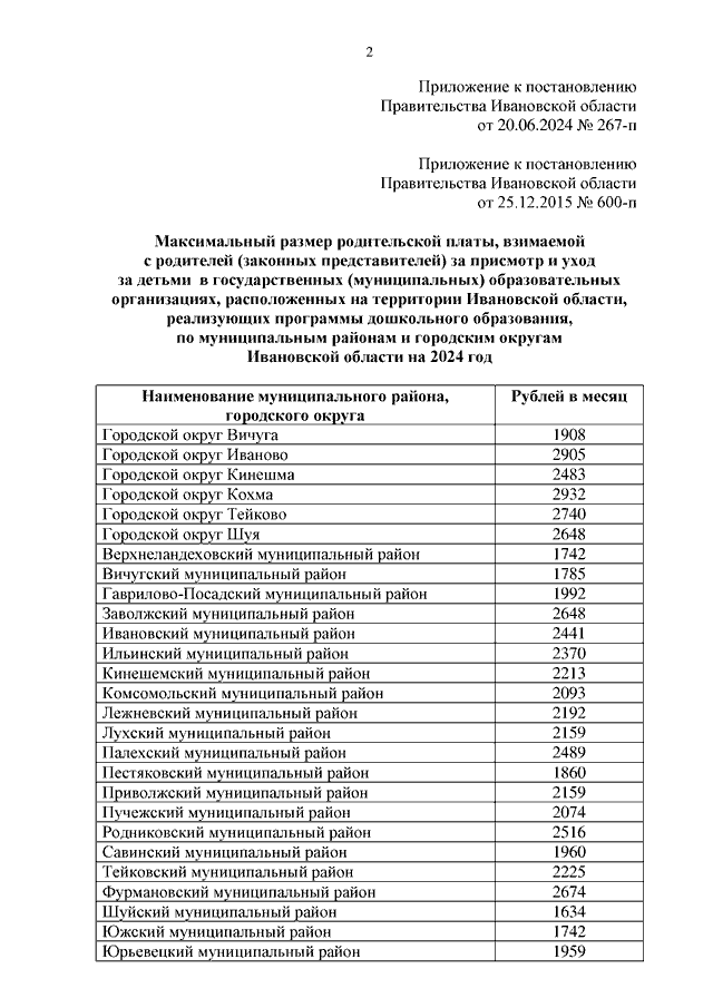 Постановление Правительства Ивановской области от 20.06.2024 N 267-п "О внесении изменения в постановление Правительства Ивановской области от 25.12.2015 N 600-п "О максимальном размере родительской платы, взимаемой с родителей (законных представителей) за присмотр и уход за детьми в государственных (муниципальных) образовательных организациях, расположенных на территории Ивановской области, реализующих программы дошкольного образования, по муниципальным районам и городским округам Ивановской области"