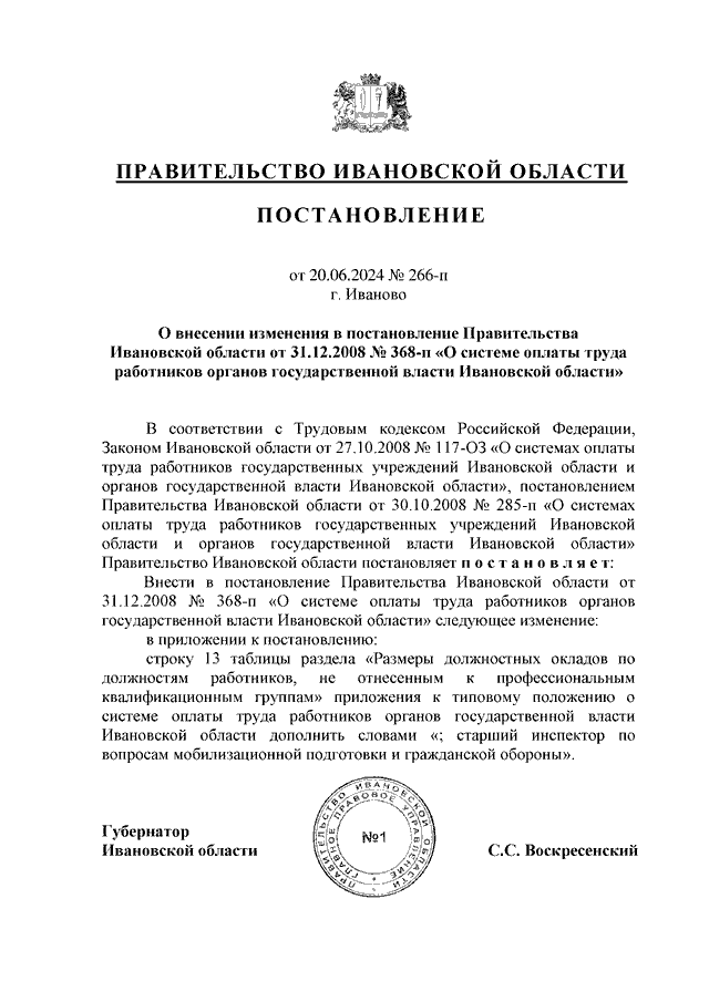 Постановление Правительства Ивановской области от 20.06.2024 N 266-п "О внесении изменения в постановление Правительства Ивановской области от 31.12.2008 N 368-п "О системе оплаты труда работников органов государственной власти Ивановской области"