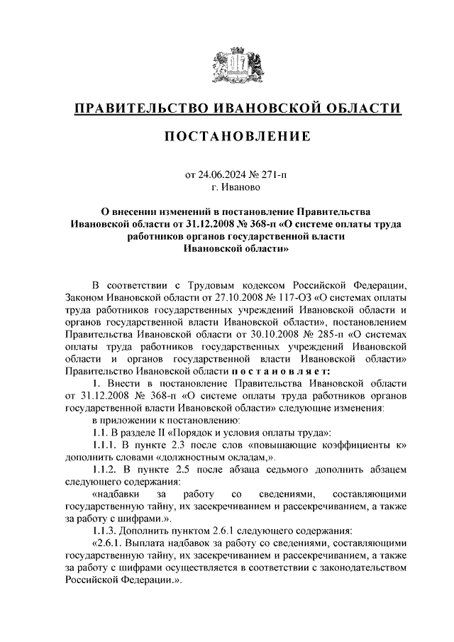 Постановление Правительства Ивановской области от 24.06.2024 N 271-п "О внесении изменений в постановление Правительства Ивановской области от 31.12.2008 N 368-п "О системе оплаты труда работников органов государственной власти Ивановской области"