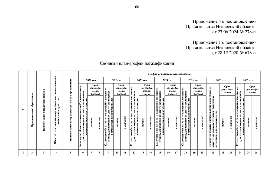 Постановление Правительства Ивановской области от 27.06.2024 N 278-п "О внесении изменений в постановление Правительства Ивановской области от 28.12.2020 N 678-п "Об утверждении региональной Программы газификации жилищно-коммунального хозяйства, промышленных и иных организаций Ивановской области на 2020 - 2030 годы" (вместе со "Сводным планом-графиком догазификации", "Пообъектным планом-графиком догазификации")