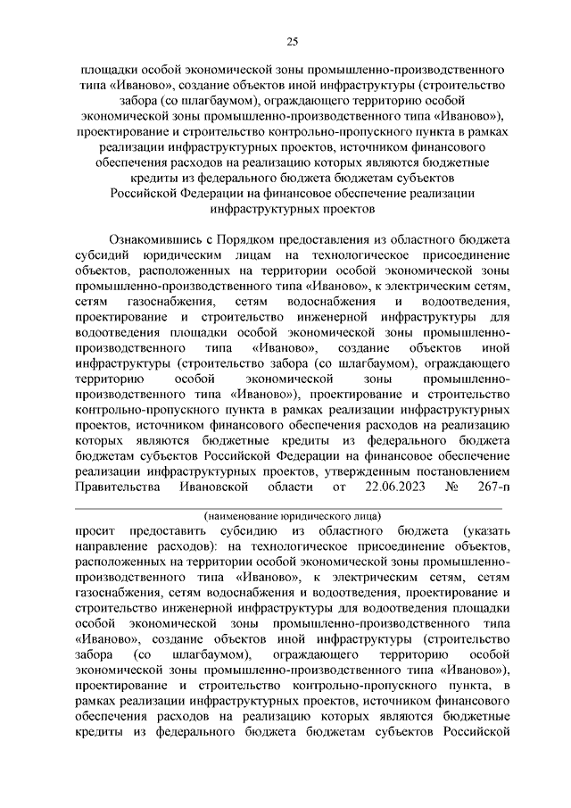 Постановление Правительства Ивановской области от 01.07.2024 N 282-п "О внесении изменений в постановление Правительства Ивановской области от 22.06.2023 N 267-п "Об утверждении Порядка предоставления из областного бюджета субсидий юридическим лицам на технологическое присоединение объектов, расположенных на территории особой экономической зоны промышленно-производственного типа "Иваново", к электрическим сетям, сетям газоснабжения, сетям водоснабжения и водоотведения, строительство инженерной инфраструктуры для водоотведения площадки особой экономической зоны промышленно-производственного типа "Иваново", создание объектов иной инфраструктуры (строительство забора (со шлагбаумом), ограждающего территорию особой экономической зоны промышленно-производственного типа "Иваново") в рамках реализации инфраструктурных проектов, источником финансового обеспечения расходов на реализацию которых являются бюджетные кредиты из федерального бюджета бюджетам субъектов Российской Федерации на финансовое обеспечение реализации инфраструктурных проектов" (вместе с "Порядком предоставления из областного бюджета субсидий юридическим лицам на технологическое присоединение объектов, расположенных на территории особой экономической зоны промышленно-производственного типа "Иваново", к электрическим сетям, сетям газоснабжения, сетям водоснабжения и водоотведения, проектирование и строительство инженерной инфраструктуры для водоотведения площадки особой экономической зоны промышленно-производственного типа "Иваново", создание объектов иной инфраструктуры (строительство забора (со шлагбаумом), ограждающего территорию особой экономической зоны промышленно-производственного типа "Иваново"), проектирование и строительство контрольно-пропускного пункта в рамках реализации инфраструктурных проектов, источником финансового обеспечения расходов на реализацию которых являются бюджетные кредиты из федерального бюджета бюджетам субъектов Российской Федерации на финансовое обеспечение реализации инфраструктурных проектов")