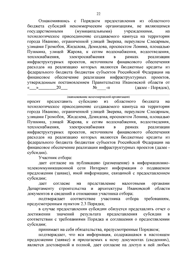 Постановление Правительства Ивановской области от 01.07.2024 N 281-п "Об утверждении Порядка предоставления из областного бюджета субсидий некоммерческим организациям, не являющимся государственными (муниципальными) учреждениями, на технологическое присоединение создаваемого кампуса на территории города Иваново, ограниченной улицей Зверева, переулком Слесарным, улицами Громобоя, Жиделева, Демидова, проспектом Ленина, площадью Пушкина, улицей Жарова, к сетям водоснабжения, водоотведения, теплоснабжения, электроснабжения в рамках реализации инфраструктурных проектов, источником финансового обеспечения расходов на реализацию которых являются бюджетные кредиты из федерального бюджета бюджетам субъектов Российской Федерации на финансовое обеспечение реализации инфраструктурных проектов"