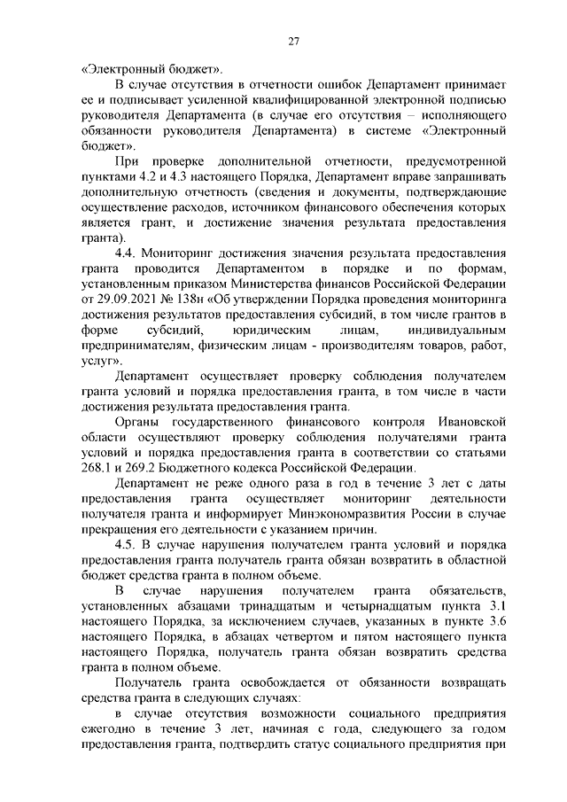 Постановление Правительства Ивановской области от 08.07.2024 N 294-п "О внесении изменений в постановление Правительства Ивановской области от 08.07.2021 N 311-п "Об утверждении Порядка определения объема и предоставления грантов в форме субсидий субъектам малого и среднего предпринимательства, осуществляющим деятельность в сфере социального предпринимательства, на реализацию проекта в сфере социального предпринимательства и (или) субъектам малого и среднего предпринимательства, созданным физическими лицами в возрасте до 25 лет включительно, на реализацию проекта в сфере предпринимательской деятельности"