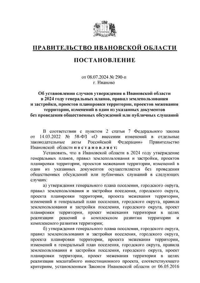 Постановление Правительства Ивановской области от 08.07.2024 N 290-п "Об установлении случаев утверждения в Ивановской области в 2024 году генеральных планов, правил землепользования и застройки, проектов планировки территории, проектов межевания территории, изменений в один из указанных документов без проведения общественных обсуждений или публичных слушаний"
