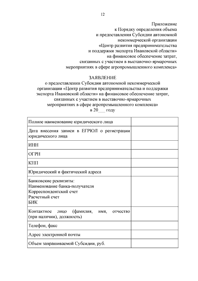 Постановление Правительства Ивановской области от 08.07.2024 N 287-п "О внесении изменений в постановление Правительства Ивановской области от 01.04.2021 N 155-п "Об утверждении Порядка определения объема и предоставления субсидии автономной некоммерческой организации "Центр развития предпринимательства и поддержки экспорта Ивановской области" на финансовое обеспечение затрат, связанных с участием в выставочно-ярмарочных мероприятиях в сфере агропромышленного комплекса"