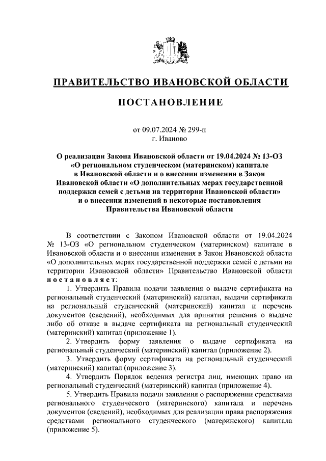 Постановление Правительства Ивановской области от 09.07.2024 N 299-п "О реализации Закона Ивановской области от 19.04.2024 N 13-ОЗ "О региональном студенческом (материнском) капитале в Ивановской области и о внесении изменения в Закон Ивановской области "О дополнительных мерах государственной поддержки семей с детьми на территории Ивановской области" и о внесении изменений в некоторые постановления Правительства Ивановской области" (вместе с "Правилами подачи заявления о выдаче сертификата на региональный студенческий (материнский) капитал, выдачи сертификата на региональный студенческий (материнский) капитал и перечнем документов (сведений), необходимых для принятия решения о выдаче либо об отказе в выдаче сертификата на региональный студенческий (материнский) капитал", "Порядком ведения регистра лиц, имеющих право на региональный студенческий (материнский) капитал", "Правилами подачи заявления о распоряжении средствами регионального студенческого (материнского) капитала и перечнем документов (сведений), необходимых для реализации права распоряжения средствами регионального студенческого (материнского) капитала", "Правилами направления средств (части средств) регионального студенческого (материнского) капитала на улучшение жилищных условий", "Правилами направления средств (части средств) регионального студенческого (материнского) капитала на получение образования ребенком", "Правилами направления средств (части средств) регионального студенческого (материнского) капитала на получение ежемесячной выплаты в связи с рождением ребенка до достижения им возраста трех лет")