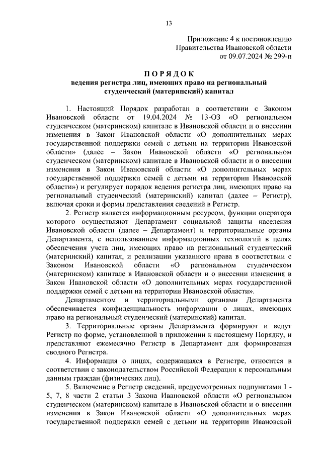 Постановление Правительства Ивановской области от 09.07.2024 N 299-п "О реализации Закона Ивановской области от 19.04.2024 N 13-ОЗ "О региональном студенческом (материнском) капитале в Ивановской области и о внесении изменения в Закон Ивановской области "О дополнительных мерах государственной поддержки семей с детьми на территории Ивановской области" и о внесении изменений в некоторые постановления Правительства Ивановской области" (вместе с "Правилами подачи заявления о выдаче сертификата на региональный студенческий (материнский) капитал, выдачи сертификата на региональный студенческий (материнский) капитал и перечнем документов (сведений), необходимых для принятия решения о выдаче либо об отказе в выдаче сертификата на региональный студенческий (материнский) капитал", "Порядком ведения регистра лиц, имеющих право на региональный студенческий (материнский) капитал", "Правилами подачи заявления о распоряжении средствами регионального студенческого (материнского) капитала и перечнем документов (сведений), необходимых для реализации права распоряжения средствами регионального студенческого (материнского) капитала", "Правилами направления средств (части средств) регионального студенческого (материнского) капитала на улучшение жилищных условий", "Правилами направления средств (части средств) регионального студенческого (материнского) капитала на получение образования ребенком", "Правилами направления средств (части средств) регионального студенческого (материнского) капитала на получение ежемесячной выплаты в связи с рождением ребенка до достижения им возраста трех лет")