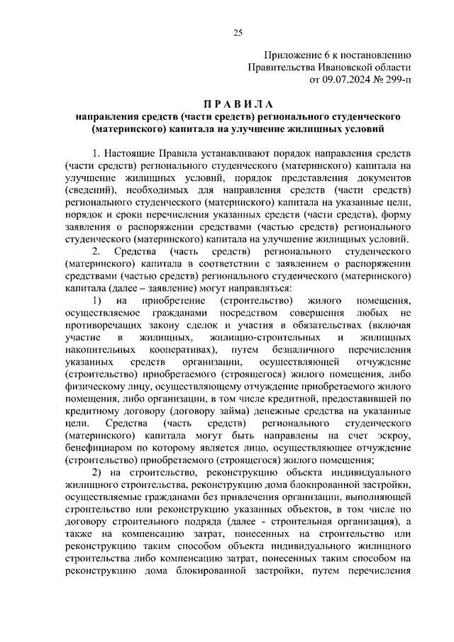Постановление Правительства Ивановской области от 09.07.2024 N 299-п "О реализации Закона Ивановской области от 19.04.2024 N 13-ОЗ "О региональном студенческом (материнском) капитале в Ивановской области и о внесении изменения в Закон Ивановской области "О дополнительных мерах государственной поддержки семей с детьми на территории Ивановской области" и о внесении изменений в некоторые постановления Правительства Ивановской области" (вместе с "Правилами подачи заявления о выдаче сертификата на региональный студенческий (материнский) капитал, выдачи сертификата на региональный студенческий (материнский) капитал и перечнем документов (сведений), необходимых для принятия решения о выдаче либо об отказе в выдаче сертификата на региональный студенческий (материнский) капитал", "Порядком ведения регистра лиц, имеющих право на региональный студенческий (материнский) капитал", "Правилами подачи заявления о распоряжении средствами регионального студенческого (материнского) капитала и перечнем документов (сведений), необходимых для реализации права распоряжения средствами регионального студенческого (материнского) капитала", "Правилами направления средств (части средств) регионального студенческого (материнского) капитала на улучшение жилищных условий", "Правилами направления средств (части средств) регионального студенческого (материнского) капитала на получение образования ребенком", "Правилами направления средств (части средств) регионального студенческого (материнского) капитала на получение ежемесячной выплаты в связи с рождением ребенка до достижения им возраста трех лет")
