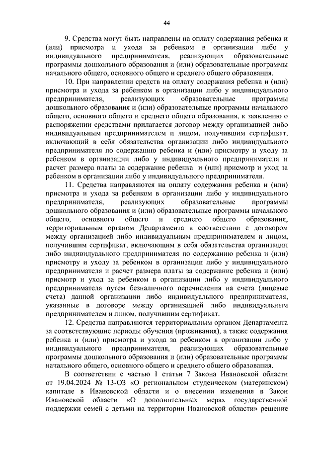 Постановление Правительства Ивановской области от 09.07.2024 N 299-п "О реализации Закона Ивановской области от 19.04.2024 N 13-ОЗ "О региональном студенческом (материнском) капитале в Ивановской области и о внесении изменения в Закон Ивановской области "О дополнительных мерах государственной поддержки семей с детьми на территории Ивановской области" и о внесении изменений в некоторые постановления Правительства Ивановской области" (вместе с "Правилами подачи заявления о выдаче сертификата на региональный студенческий (материнский) капитал, выдачи сертификата на региональный студенческий (материнский) капитал и перечнем документов (сведений), необходимых для принятия решения о выдаче либо об отказе в выдаче сертификата на региональный студенческий (материнский) капитал", "Порядком ведения регистра лиц, имеющих право на региональный студенческий (материнский) капитал", "Правилами подачи заявления о распоряжении средствами регионального студенческого (материнского) капитала и перечнем документов (сведений), необходимых для реализации права распоряжения средствами регионального студенческого (материнского) капитала", "Правилами направления средств (части средств) регионального студенческого (материнского) капитала на улучшение жилищных условий", "Правилами направления средств (части средств) регионального студенческого (материнского) капитала на получение образования ребенком", "Правилами направления средств (части средств) регионального студенческого (материнского) капитала на получение ежемесячной выплаты в связи с рождением ребенка до достижения им возраста трех лет")