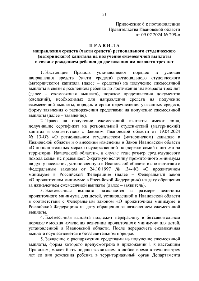 Постановление Правительства Ивановской области от 09.07.2024 N 299-п "О реализации Закона Ивановской области от 19.04.2024 N 13-ОЗ "О региональном студенческом (материнском) капитале в Ивановской области и о внесении изменения в Закон Ивановской области "О дополнительных мерах государственной поддержки семей с детьми на территории Ивановской области" и о внесении изменений в некоторые постановления Правительства Ивановской области" (вместе с "Правилами подачи заявления о выдаче сертификата на региональный студенческий (материнский) капитал, выдачи сертификата на региональный студенческий (материнский) капитал и перечнем документов (сведений), необходимых для принятия решения о выдаче либо об отказе в выдаче сертификата на региональный студенческий (материнский) капитал", "Порядком ведения регистра лиц, имеющих право на региональный студенческий (материнский) капитал", "Правилами подачи заявления о распоряжении средствами регионального студенческого (материнского) капитала и перечнем документов (сведений), необходимых для реализации права распоряжения средствами регионального студенческого (материнского) капитала", "Правилами направления средств (части средств) регионального студенческого (материнского) капитала на улучшение жилищных условий", "Правилами направления средств (части средств) регионального студенческого (материнского) капитала на получение образования ребенком", "Правилами направления средств (части средств) регионального студенческого (материнского) капитала на получение ежемесячной выплаты в связи с рождением ребенка до достижения им возраста трех лет")