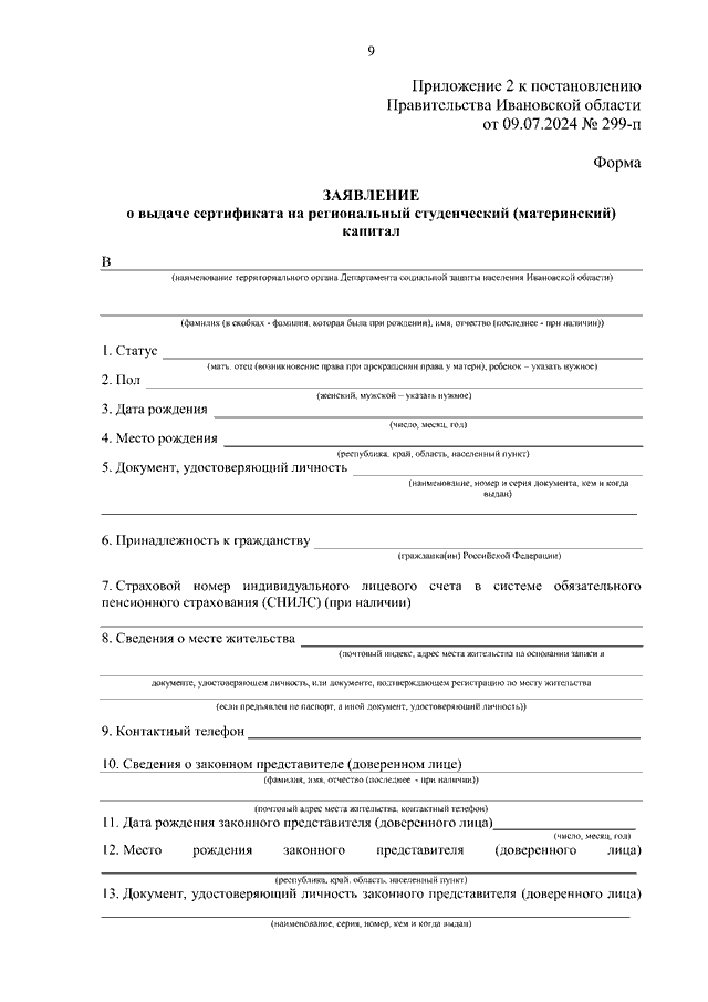 Постановление Правительства Ивановской области от 09.07.2024 N 299-п "О реализации Закона Ивановской области от 19.04.2024 N 13-ОЗ "О региональном студенческом (материнском) капитале в Ивановской области и о внесении изменения в Закон Ивановской области "О дополнительных мерах государственной поддержки семей с детьми на территории Ивановской области" и о внесении изменений в некоторые постановления Правительства Ивановской области" (вместе с "Правилами подачи заявления о выдаче сертификата на региональный студенческий (материнский) капитал, выдачи сертификата на региональный студенческий (материнский) капитал и перечнем документов (сведений), необходимых для принятия решения о выдаче либо об отказе в выдаче сертификата на региональный студенческий (материнский) капитал", "Порядком ведения регистра лиц, имеющих право на региональный студенческий (материнский) капитал", "Правилами подачи заявления о распоряжении средствами регионального студенческого (материнского) капитала и перечнем документов (сведений), необходимых для реализации права распоряжения средствами регионального студенческого (материнского) капитала", "Правилами направления средств (части средств) регионального студенческого (материнского) капитала на улучшение жилищных условий", "Правилами направления средств (части средств) регионального студенческого (материнского) капитала на получение образования ребенком", "Правилами направления средств (части средств) регионального студенческого (материнского) капитала на получение ежемесячной выплаты в связи с рождением ребенка до достижения им возраста трех лет")
