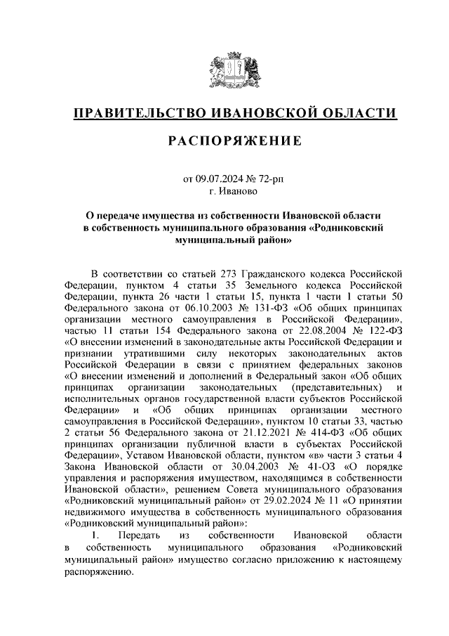 Распоряжение Правительства Ивановской области от 09.07.2024 N 72-рп "О передаче имущества из собственности Ивановской области в собственность муниципального образования "Родниковский муниципальный район"