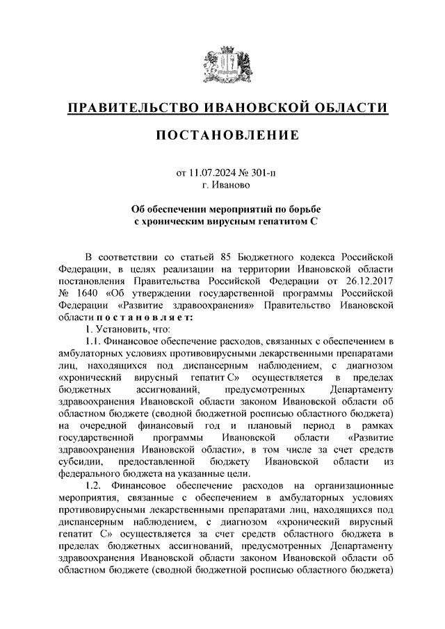 Постановление Правительства Ивановской области от 11.07.2024 N 301-п "Об обеспечении мероприятий по борьбе с хроническим вирусным гепатитом C"