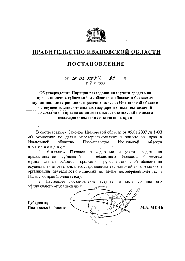 Постановление Правительства Ивановской области от 20.02.2007 N 29-п "Об утверждении Порядка расходования и учета средств на предоставление субвенций из областного бюджета бюджетам муниципальных районов, городских округов Ивановской области на осуществление отдельных государственных полномочий по созданию и организации деятельности комиссий по делам несовершеннолетних и защите их прав"