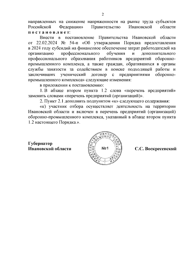 Постановление Правительства Ивановской области от 18.07.2024 N 315-п "О внесении изменений в постановление Правительства Ивановской области от 22.02.2024 N 54-п "Об утверждении Порядка предоставления в 2024 году субсидий на финансовое обеспечение затрат работодателей на организацию профессионального обучения и дополнительного профессионального образования работников предприятий оборонно-промышленного комплекса, а также граждан, обратившихся в органы службы занятости за содействием в поиске подходящей работы и заключивших ученический договор с предприятиями оборонно-промышленного комплекса"