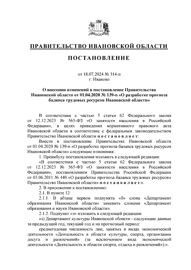 Постановление Правительства Ивановской области от 18.07.2024 N 314-п "О внесении изменений в постановление Правительства Ивановской области от 01.04.2020 N 139-п "О разработке прогноза баланса трудовых ресурсов Ивановской области"