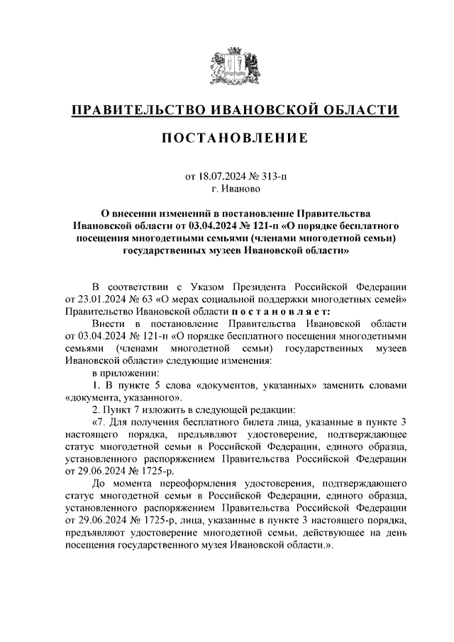 Постановление Правительства Ивановской области от 18.07.2024 N 313-п "О внесении изменений в постановление Правительства Ивановской области от 03.04.2024 N 121-п "О порядке бесплатного посещения многодетными семьями (членами многодетной семьи) государственных музеев Ивановской области"