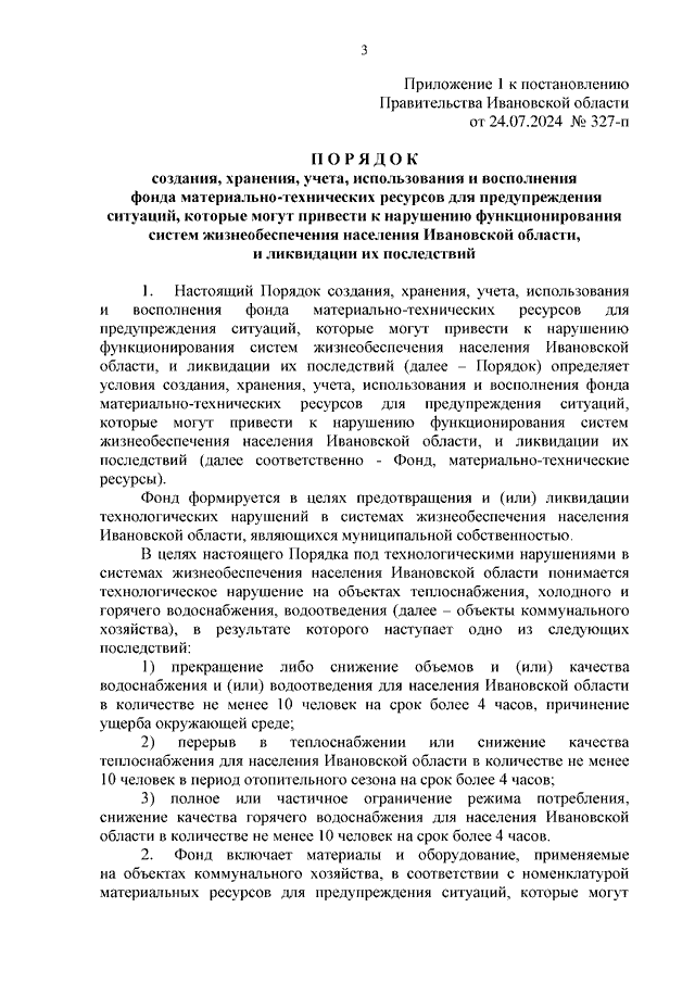 Постановление Правительства Ивановской области от 24.07.2024 N 327-п "О фонде материально-технических ресурсов для предупреждения ситуаций, которые могут привести к нарушению функционирования систем жизнеобеспечения населения Ивановской области, и ликвидации их последствий" (вместе с "Порядком создания, хранения, учета, использования и восполнения фонда материально-технических ресурсов для предупреждения ситуаций, которые могут привести к нарушению функционирования систем жизнеобеспечения населения Ивановской области, и ликвидации их последствий", "Номенклатурой материальных ресурсов для предупреждения ситуаций, которые могут привести к нарушению функционирования систем жизнеобеспечения населения Ивановской области, и ликвидации их последствий")