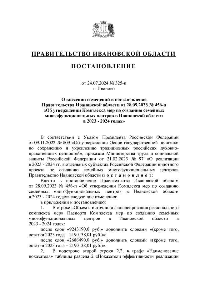 Постановление Правительства Ивановской области от 24.07.2024 N 325-п "О внесении изменений в постановление Правительства Ивановской области от 28.09.2023 N 456-п "Об утверждении Комплекса мер по созданию семейных многофункциональных центров в Ивановской области в 2023 - 2024 годах"