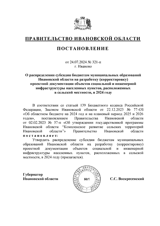 Постановление Правительства Ивановской области от 24.07.2024 N 321-п "О распределении субсидии бюджетам муниципальных образований Ивановской области на разработку (корректировку) проектной документации объектов социальной и инженерной инфраструктуры населенных пунктов, расположенных в сельской местности, в 2024 году"
