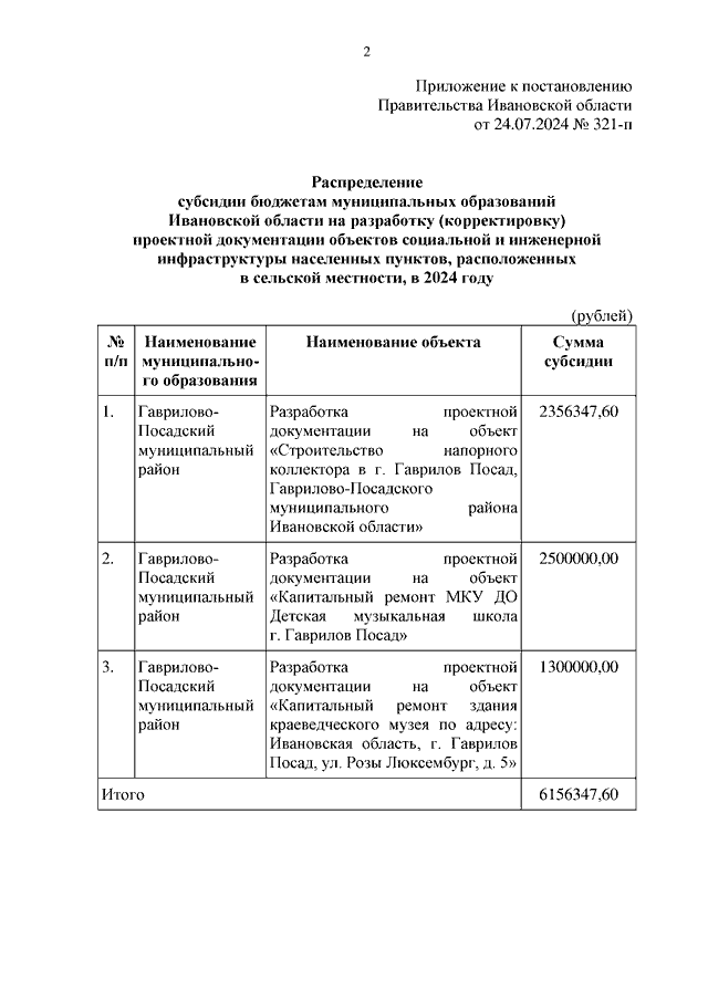 Постановление Правительства Ивановской области от 24.07.2024 N 321-п "О распределении субсидии бюджетам муниципальных образований Ивановской области на разработку (корректировку) проектной документации объектов социальной и инженерной инфраструктуры населенных пунктов, расположенных в сельской местности, в 2024 году"