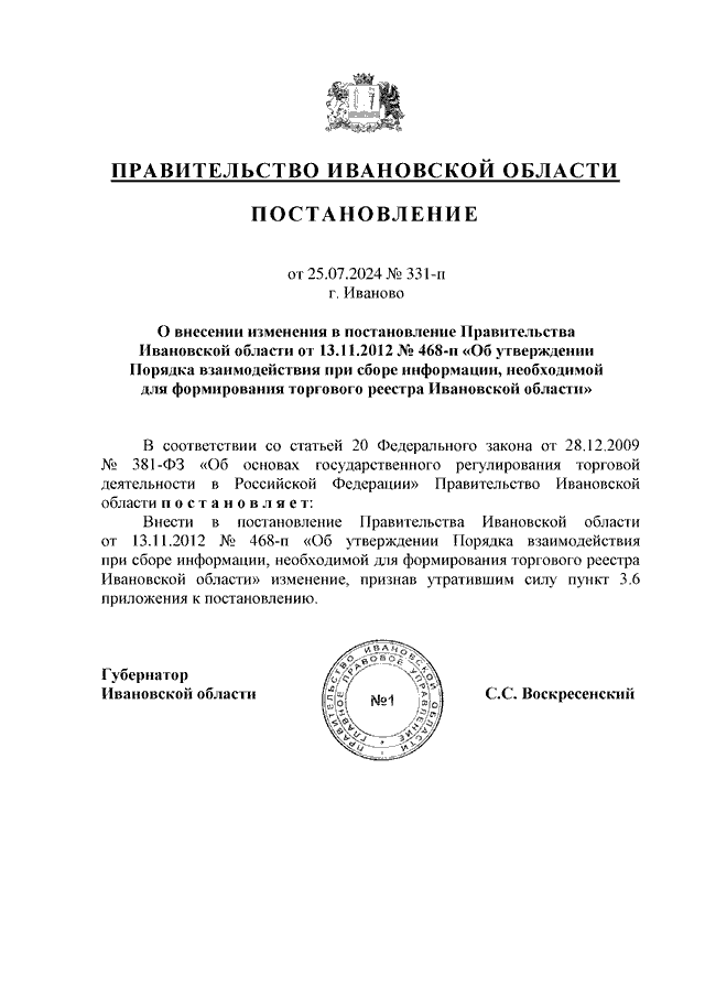 Постановление Правительства Ивановской области от 25.07.2024 N 331-п "О внесении изменения в постановление Правительства Ивановской области от 13.11.2012 N 468-п "Об утверждении Порядка взаимодействия при сборе информации, необходимой для формирования торгового реестра Ивановской области"