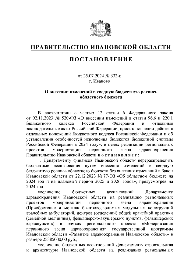 Постановление Правительства Ивановской области от 25.07.2024 N 332-п "О внесении изменений в сводную бюджетную роспись областного бюджета"