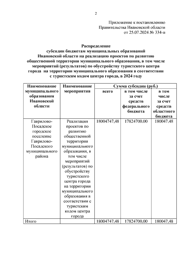 Постановление Правительства Ивановской области от 25.07.2024 N 334-п "О распределении субсидий бюджетам муниципальных образований Ивановской области на реализацию проектов по развитию общественной территории муниципального образования, в том числе мероприятий (результатов) по обустройству туристского центра города на территории муниципального образования в соответствии с туристским кодом центра города, в 2024 году"