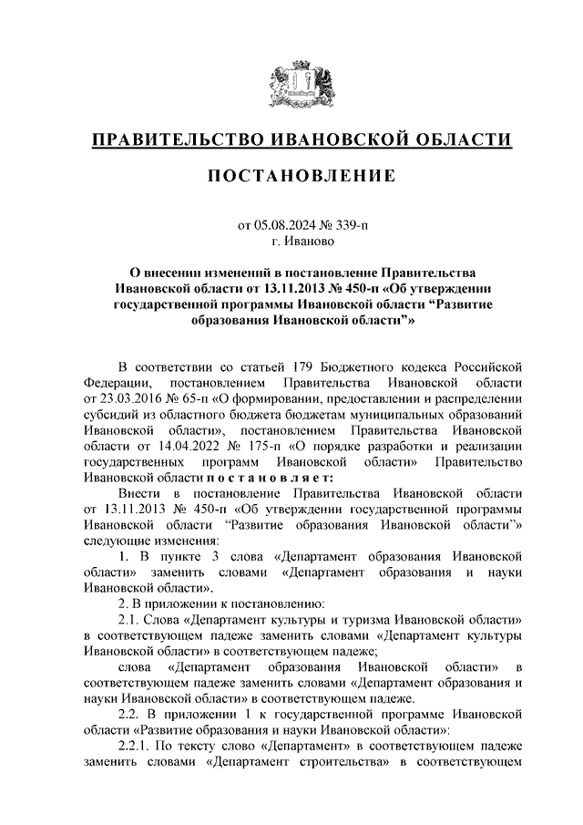 Постановление Правительства Ивановской области от 05.08.2024 N 339-п "О внесении изменений в постановление Правительства Ивановской области от 13.11.2013 N 450-п "Об утверждении государственной программы Ивановской области "Развитие образования Ивановской области"
