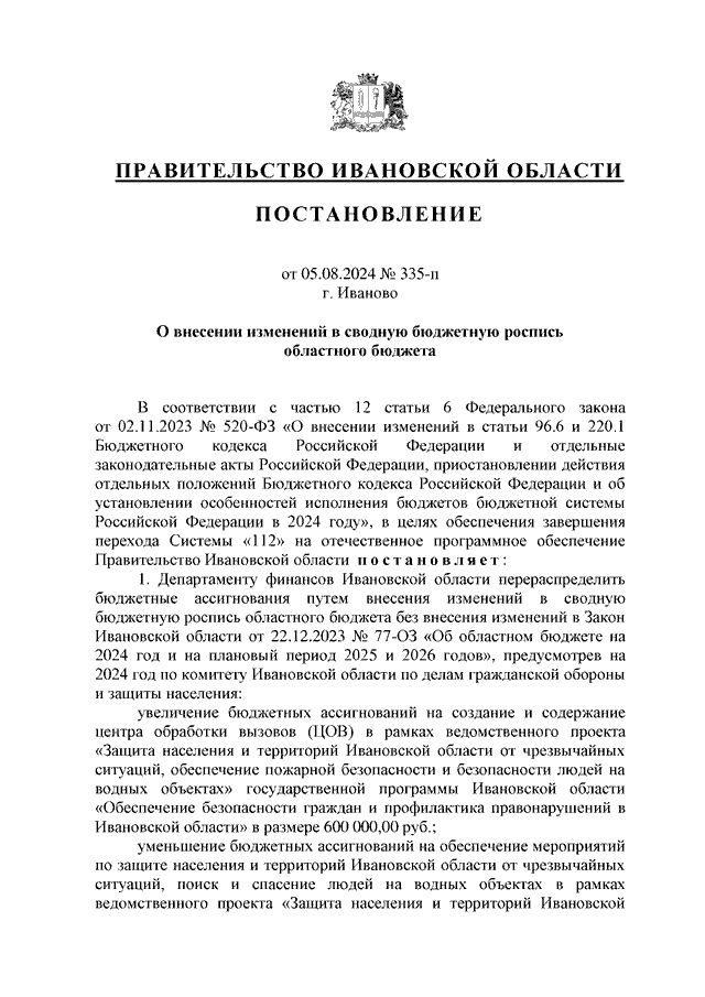 Постановление Правительства Ивановской области от 05.08.2024 N 335-п "О внесении изменений в сводную бюджетную роспись областного бюджета"