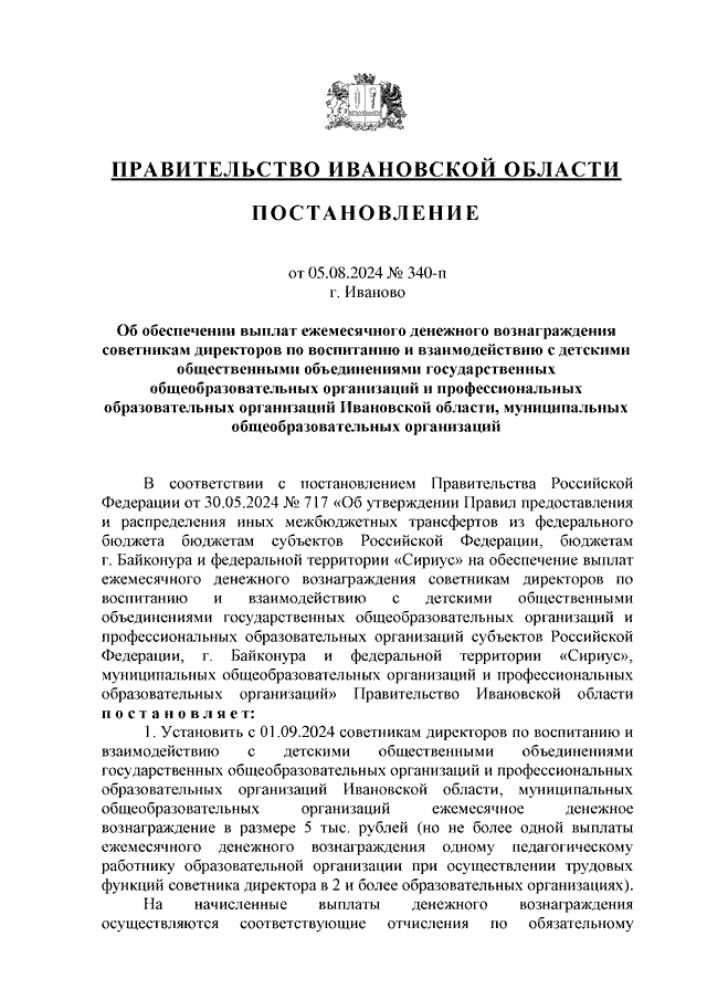 Постановление Правительства Ивановской области от 05.08.2024 N 340-п "Об обеспечении выплат ежемесячного денежного вознаграждения советникам директоров по воспитанию и взаимодействию с детскими общественными объединениями государственных общеобразовательных организаций и профессиональных образовательных организаций Ивановской области, муниципальных общеобразовательных организаций"