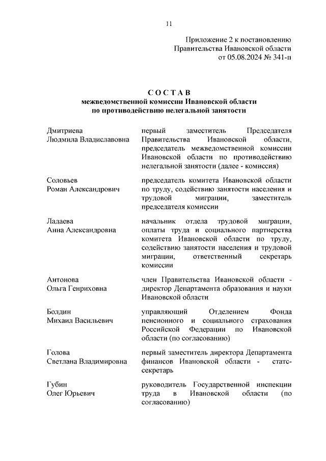 Постановление Правительства Ивановской области от 05.08.2024 N 341-п "О мерах по противодействию нелегальной занятости в Ивановской области" (вместе с "Положением о межведомственной комиссии Ивановской области по противодействию нелегальной занятости", "Перечнем муниципальных образований Ивановской области, на территориях которых должны быть созданы рабочие группы межведомственной комиссии по противодействию нелегальной занятости в Ивановской области, являющиеся ее неотъемлемой частью", "Положением о порядке создания и деятельности рабочих групп межведомственной комиссии Ивановской области по противодействию нелегальной занятости")