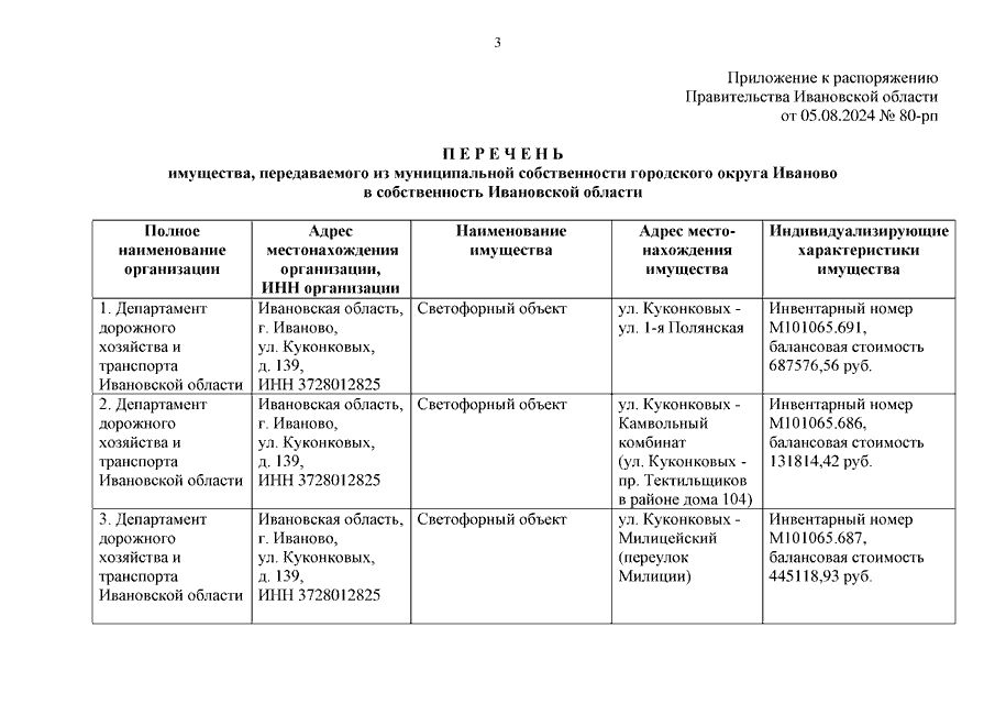 Распоряжение Правительства Ивановской области от 05.08.2024 N 80-рп "О передаче из муниципальной собственности городского округа Иваново в собственность Ивановской области движимого имущества для обеспечения безопасности дорожного движения"