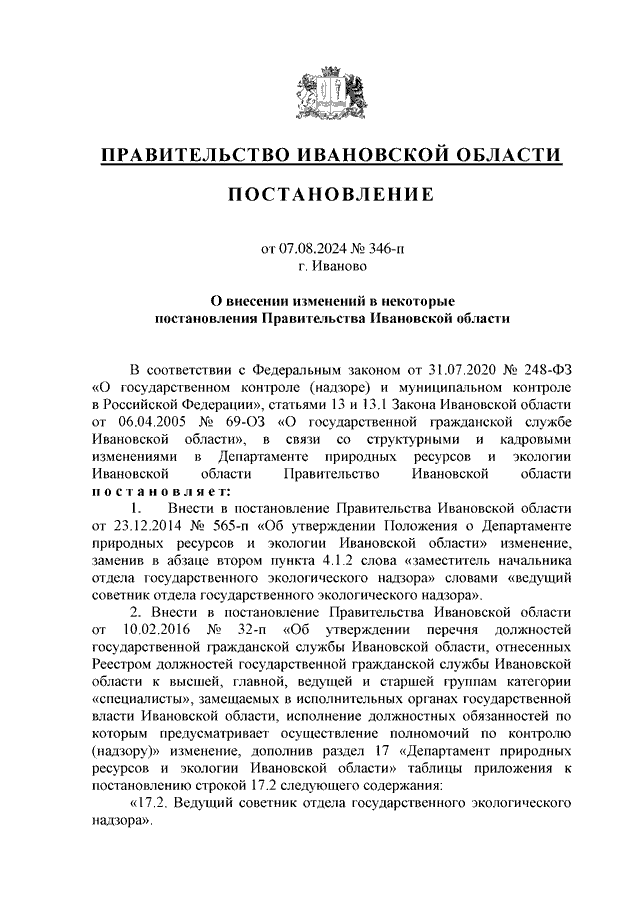 Постановление Правительства Ивановской области от 07.08.2024 N 346-п "О внесении изменений в некоторые постановления Правительства Ивановской области"