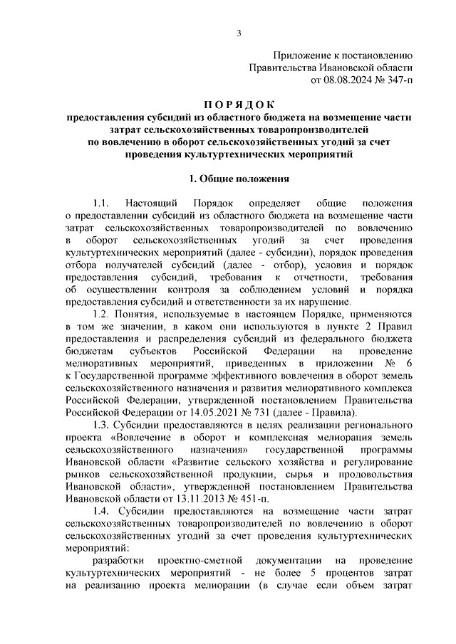 Постановление Правительства Ивановской области от 08.08.2024 N 347-п "Об утверждении Порядка предоставления субсидий из областного бюджета на возмещение части затрат сельскохозяйственных товаропроизводителей по вовлечению в оборот сельскохозяйственных угодий за счет проведения культуртехнических мероприятий"
