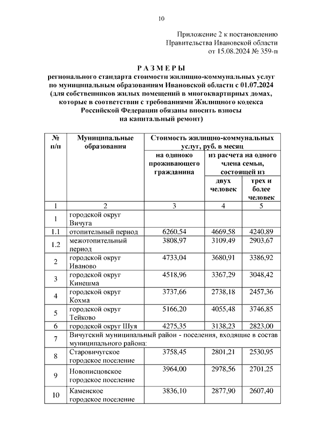 Постановление Правительства Ивановской области от 15.08.2024 N 359-п "Об установлении размеров региональных стандартов стоимости жилищно-коммунальных услуг"