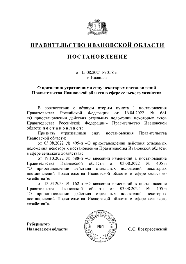 Постановление Правительства Ивановской области от 15.08.2024 N 358-п "О признании утратившими силу некоторых постановлений Правительства Ивановской области в сфере сельского хозяйства"