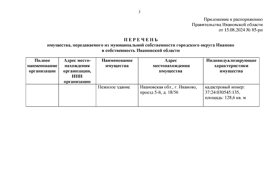 Распоряжение Правительства Ивановской области от 15.08.2024 N 85-рп "О передаче имущества из муниципальной собственности городского округа Иваново в собственность Ивановской области"