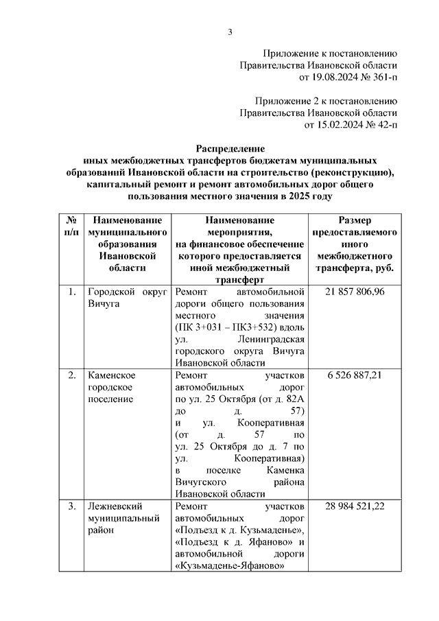 Постановление Правительства Ивановской области от 19.08.2024 N 361-п "О внесении изменений в постановление Правительства Ивановской области от 15.02.2024 N 42-п "О распределении иных межбюджетных трансфертов бюджетам муниципальных образований Ивановской области на строительство (реконструкцию), капитальный ремонт и ремонт автомобильных дорог общего пользования местного значения в 2024 году и о признании утратившими силу некоторых постановлений Правительства Ивановской области"