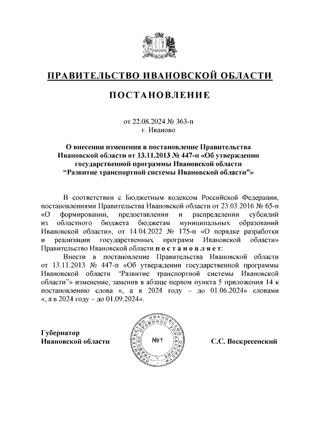 Постановление Правительства Ивановской области от 22.08.2024 N 363-п "О внесении изменения в постановление Правительства Ивановской области от 13.11.2013 N 447-п "Об утверждении государственной программы Ивановской области "Развитие транспортной системы Ивановской области"